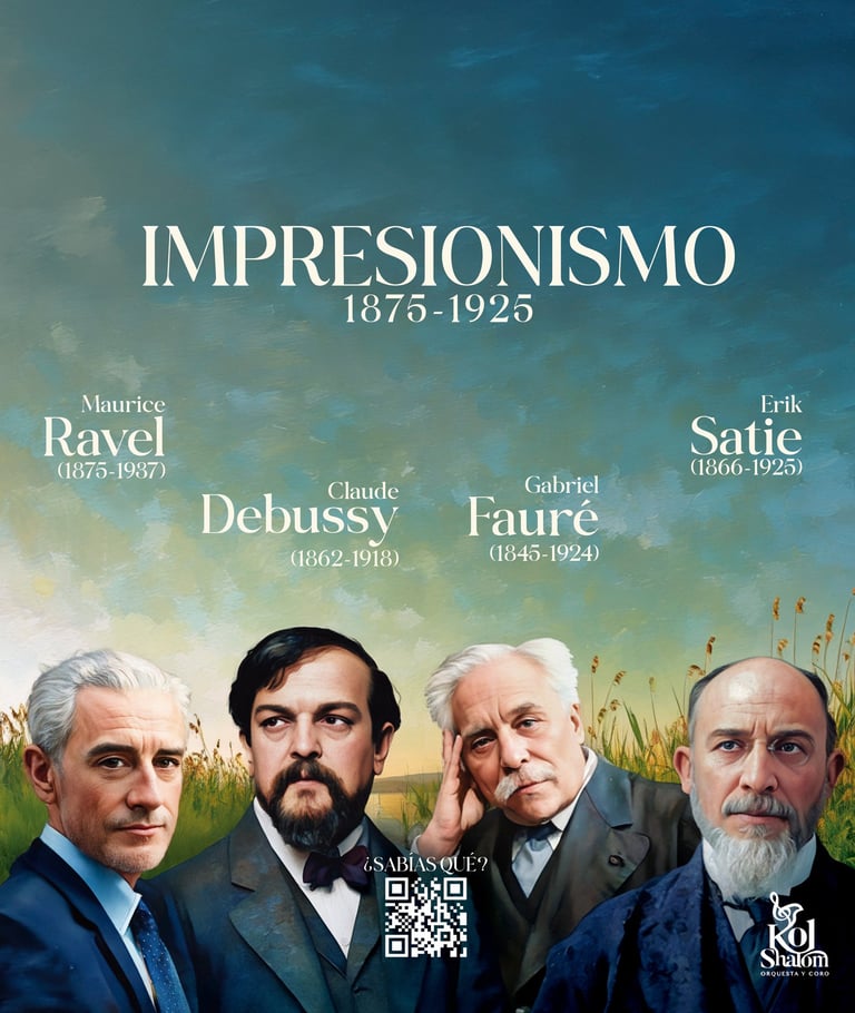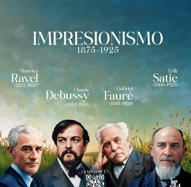 El Impresionismo fue una corriente musical inspirada en el arte y la literatura, donde los compositores buscaban evocar sensaciones, paisajes y emociones sutiles. En lugar de estructuras rígidas, esta música es fluida, etérea y rica en colores sonoros, como una pintura que se difumina suavemente. Los compositores impresionistas rompieron con las formas tradicionales para crear atmósferas sugerentes, utilizando armonías innovadoras y escalas exóticas.